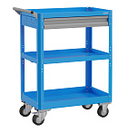 Корпус выполнен из листовой стали толщиной от 0,6 до 1,5мм., покрыт полимерной порошковой краской. С выдвижным ящиком на шариковых телескопических направляющих. Комплект резиновых ковриков. Общая равномерно-распределённая нагрузка на тележку - до 100кг. Верхняя и средняя полка имеют высоту борта 40 мм., нижняя полка имеет высоту борта 60 мм. Размер 950х800х450 мм.