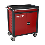 Тележка с одним ящиком и дверками для хранения ручного инструмента как в евроложементах, так и без них, мелкой оснастики и расходных материалов. Оборудована направляющими полного выдвижения. Запирается отдельным замком. Отсек с дверками используется для хранения инструмента в кейсах, переносных сварочных аппаратов, пневмоинструмента и т.п. Два колеса неповоротные, два колеса поворотные, одно из которых с тормозом. Размеры (высота x ширина x глубина): 850 х 700 х 460 мм. Вес: 34 кг.