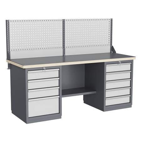 Для тяжелых сборочных, слесарных постов и на производстве в закрытых помещениях. Нагрузка на столешницу 3000 кг. Тумбы и опоры из профилированной холоднокатаной стали и имеют сварную конструкцию. На тумбы с выдвижными ящиками установлена система антиопрокидывания. В ящиках качественные усиленные шариковые направляющие полного выдвижения. Верстак покрыт ударопрочной и износостойкой порошковой краской. Для комфортной работы стоя и сидя. Размеры: 870x1993x743. Поставляется в 4 комплектациях на выбор.