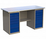Верстак двухтумбовый поставляется в разобранном виде (4 элемента). Нагрузка на столешницу до 600 кг. Стандартный цвет: корпус - серый глянец RAL 7030, ящики и двери тумб - синий RAL 5017. Размеры:855x1400x700 мм. Масса: 116 кг.