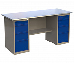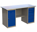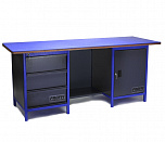 Верстак двухтумбовый поставляется в разобранном виде (4 элемента). Нагрузка на столешницу до 600 кг. Стандартный цвет: корпус - серый глянец RAL 7030, ящики и двери тумб - синий RAL 5017. Размеры:855x1400x700 мм. Масса: 107 кг.