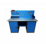 Верстак поставляется в разобранном виде (4 элемента). Нагрузка на столешницу до 600 кг. Стандартный цвет: корпус - серый глянец RAL 7030, ящики и двери тумб - синий RAL 5017. Размеры (ВхШхГ) 855х1400х700 мм. Вес 92 кг.