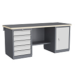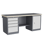 Двухтумбовый. Допустимая нагрузка на столешницу 1000 кг. Опорные элементы выполнены сварными из холоднокатаной стали. Для выполнения сборочных, ремонтных, слесарных, монтажных и других видов работ на производстве, в сервисных центрах, мастерских, гаражах, а также для обучения технологии в учебных заведениях. Комплектуется полкой-стенкой, расположенной под столешницей для удобного размещения габаритного инструмента и оснастки. Размеры верстака: 855x1596x696 мм. Вес: 88 кг. Поставляется в 4 комплектациях на выбор.