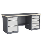 Двухтумбовый. Допустимая нагрузка на столешницу 1000 кг. Опорные элементы выполнены сварными из холоднокатаной стали. Для выполнения сборочных, ремонтных, слесарных, монтажных и других видов работ на производстве, в сервисных центрах, мастерских, гаражах, а также для обучения технологии в учебных заведениях. Комплектуется полкой-стенкой, расположенной под столешницей для удобного размещения габаритного инструмента и оснастки. Размеры верстака: 855x1796x696 мм. Вес: 133 кг. Поставляется в 4 комплектациях на выбор.