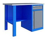 Однотумбовый. Допустимая нагрузка на столешницу 750 кг. Опорные элементы выполнены сварными из холоднокатаной стали. Верстак состоит из столешницы, опоры, тумбы P7 с дверью, полки-стенки и одинарного экрана с кронштейнами. Все металлические элементы покрыты полиэфирной порошковой краской. Столешница состоит из фанеры марки ФСФ толщиной 24 мм, которая покрыта лаком-антисептиком и листом оцинкованной холоднокатаной стали толщиной 1,2 мм. Размеры (ВхШхГ) 1470x1196x696 мм.