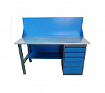 Однотумбовый. Допустимая нагрузка на столешницу 750 кг. Опорные элементы выполнены сварными из холоднокатаной стали. Верстак состоит из столешницы, опоры, тумбы P5 с четырьмя малыми и одним большим ящиком и полки-стенки. Все металлические элементы покрыты полиэфирной порошковой краской. Столешница состоит из фанеры марки ФСФ толщиной 24 мм, которая покрыта лаком-антисептиком и листом оцинкованной холоднокатаной стали толщиной 1,2 мм. Размеры (ВхШхГ) 855x1396x696 мм.