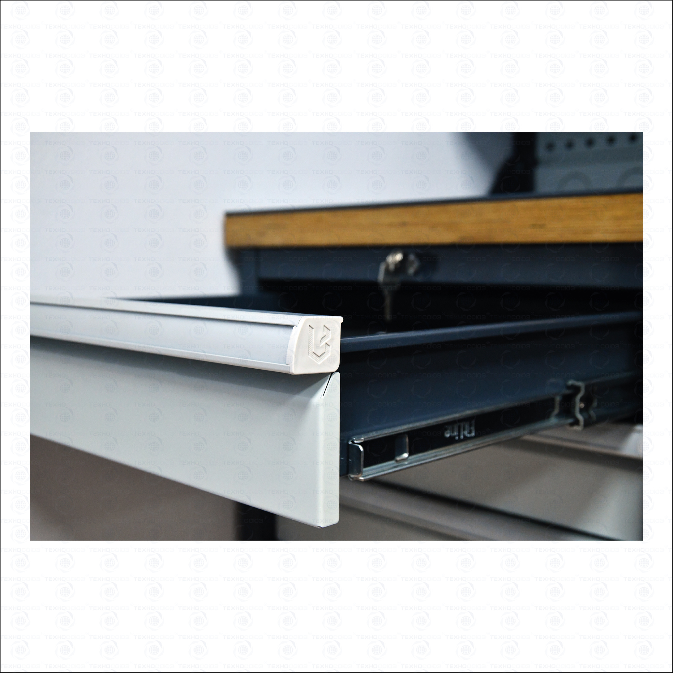 Тумбы и опоры верстаков выполнены из профилированной холоднокатаной стали и имеют сварную конструкцию. Возможна установка любых сочетаний тумб с различным количеством выдвижных ящиков, а также с дверцей и полками. Между тумбами и опорами возможна установка полки-стенки. На каждой ручке ящика и двери закреплен специальный алюминиевый профиль с отделением для установки маркировки. На тумбы с выдвижными ящиками установлена система антиопрокидывания, которая ограничивает выдвижение остальных ящиков тумбы, если один из ящиков выдвинут. Ящики снабжены специальными усиленными шариковыми направляющими. Тумбы снабжены центральной системой запирания.