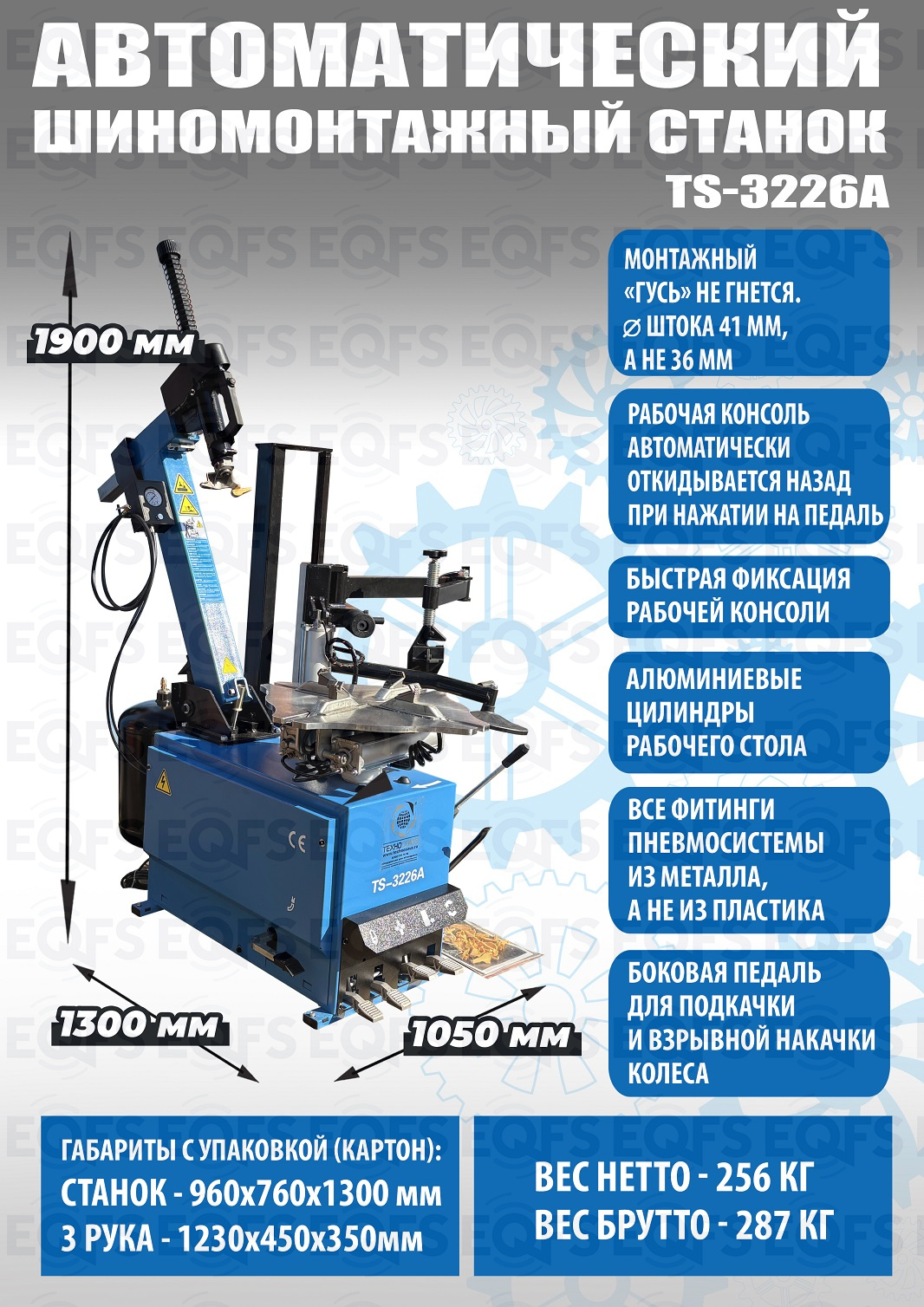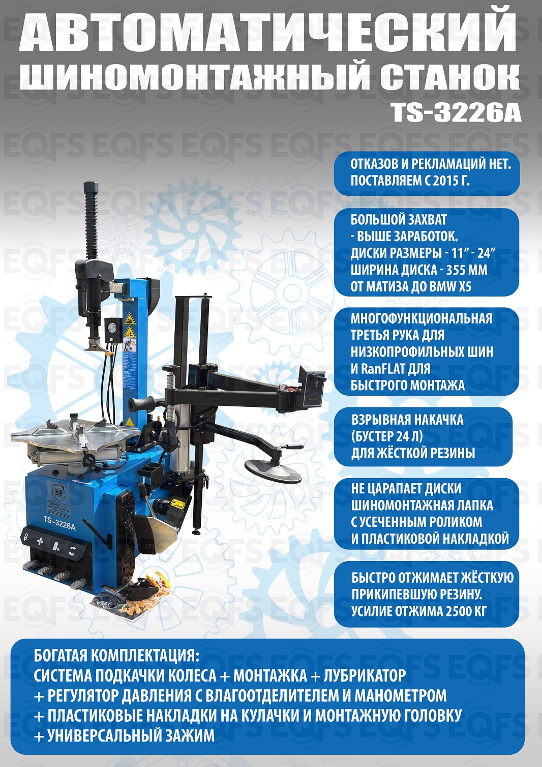 Автоматического шиномонтажного стенда TS-3226А предназначен для монтажа и демонтажа шин легковых автомобилей, внедорожников и легких грузовиков с размером колес 11-24 дюйма. Усилие пневмоцилиндра в 2500 кг. В комплекте: полноценная 3-й рука для работы с жесткой и низкопрофильной резиной RUNFLAT. + встроенный бустер  24 литра (взрывная подкачка) + пистолет для подкачки шин + монтажка + регулятор давления с влагоотделителем и манометром.
