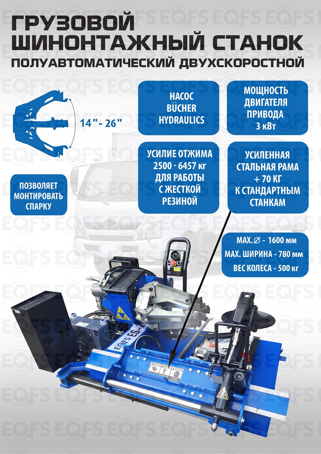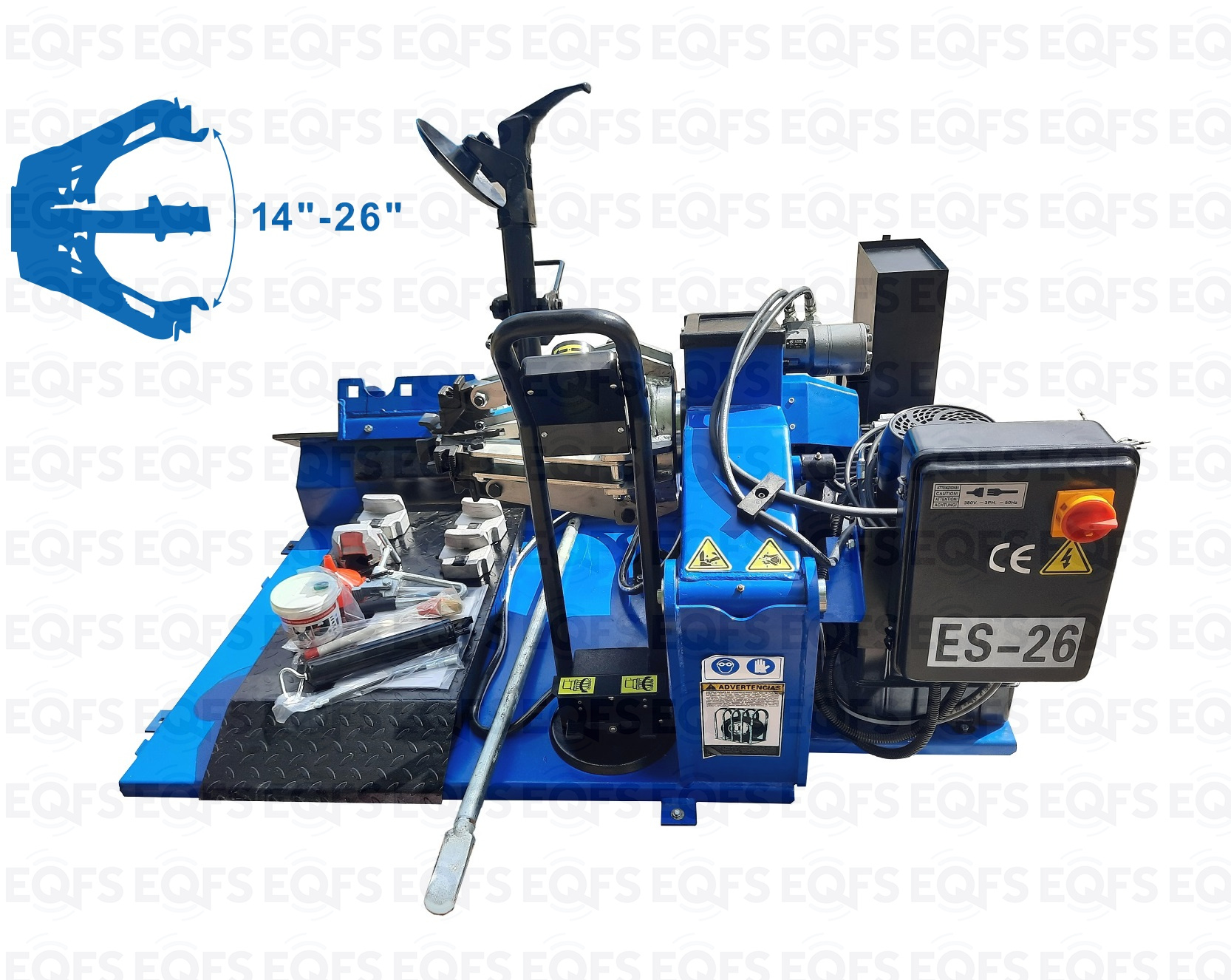 ES-26 грузовой шиномонтажный станок Нет редуктора- нет трущихся деталей. Защита от перегрузок и неправильной эксплуатации. Усиленная стальная рама. Мобильная консоль управления. 2-х скоростной, 14÷26”. Мощность привода 3,0 кВт. Гарантия 18мес. Диски сталь, AL, с кольцами и без. Колесо макс. Ø1600 ширина 780мм, до 500кг.