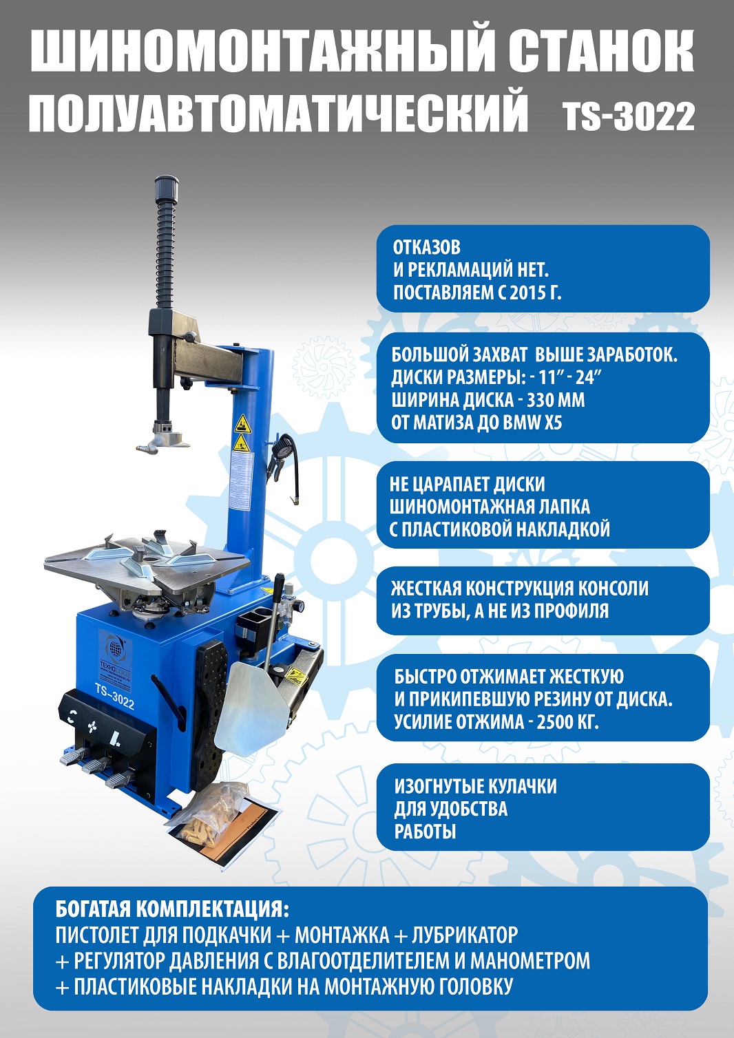 Шиномонтажного полуавтоматического станка TS-3022 предназначен для монтажа и демонтажа колес легковых автомобилей, легких грузовиков, не больших автобусов и коммерческой техники. Внешний зажим 11-21”. Внутренний зажим 12-24”.В комплекте: пистолет для подкачки шин + монтажка + регулятор давления с влагоотделителем и манометром. Рекомендуется для постов со средней и высокой проходимостью