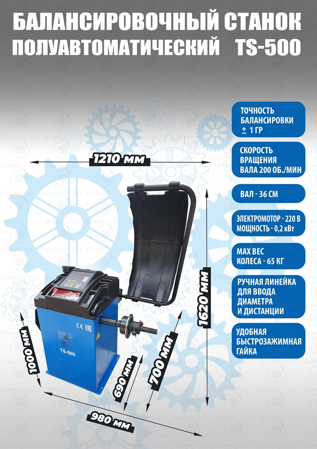 + TS-500 Балансировочный станок для колес легковых автомобилей, мотоциклов и легких грузовиков с диаметром диска с резиной до 760 мм. Размеры диска: ширина 3–9” (76-228 мм) , диаметр диска" -  10–21” (254-533 мм). Вал-36 мм. Максимальный вес колеса с диском – 65 кг. Точность ±1гр. Напряжение 220В.  В комплекте: кожух с автозапуском + клещи + кронциркуль + быстрозажимная гайка + набор конусов. Данные станки возим более 10 лет. Надежные - не подведут в сезон!!!