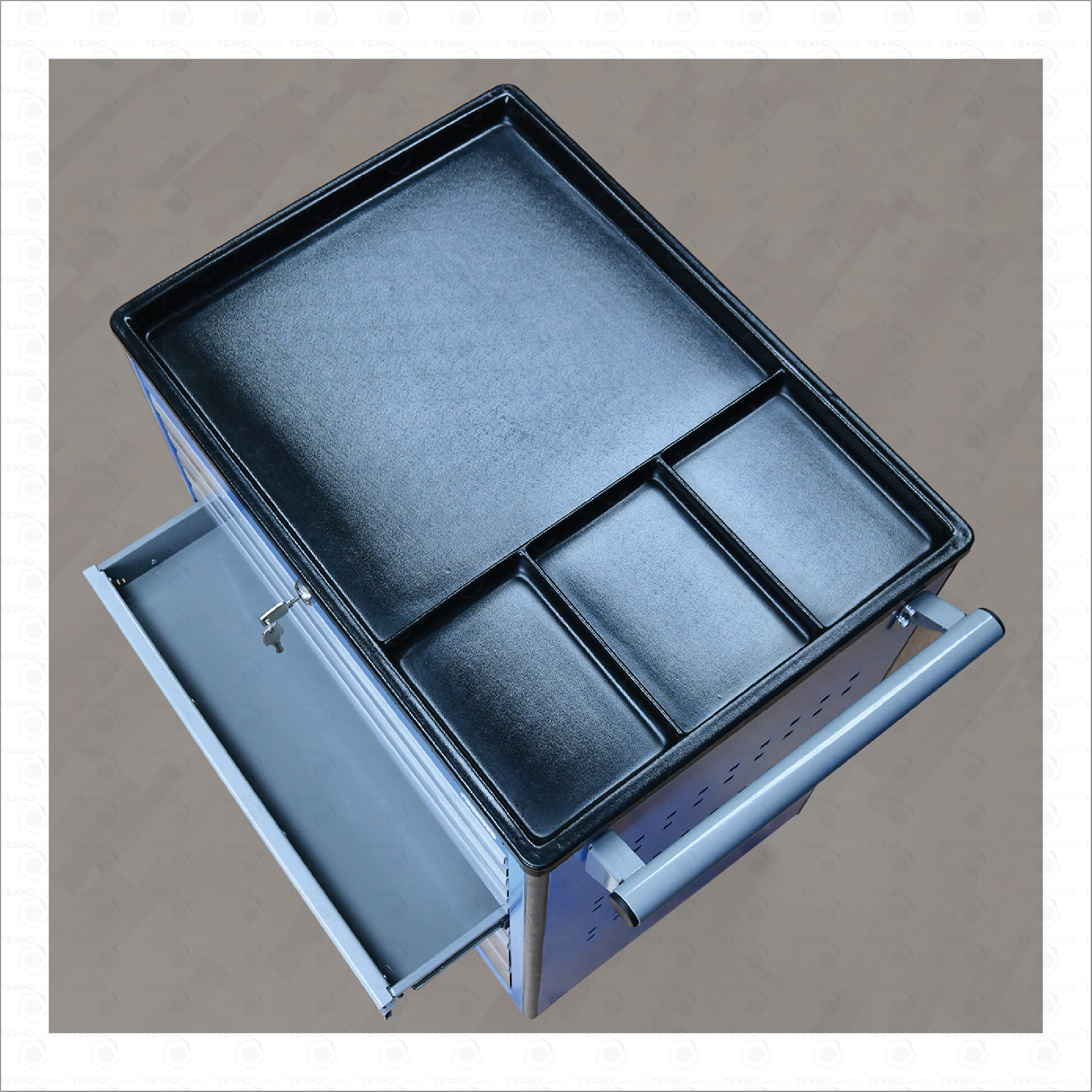 Ящики устанавливаются на шариковых телескопических направляющих полного выдвижения. Обеспечен свободный и плавный ход ящиков даже при полной загрузке. На лицевой панели каждого ящика установлена ручка-накладка. Каждый ящик снабжен клавишной системой антиоткрывания из оцинкованной стали, препятствующей самопроизвольному выдвижению ящиков, например, при наклоне или перемещении тележки.