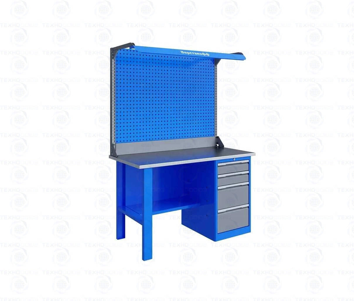 Верстак комплектуется полкой-стенкой, расположенной под столешницей для удобного размещения габаритного инструмента и оснастки.